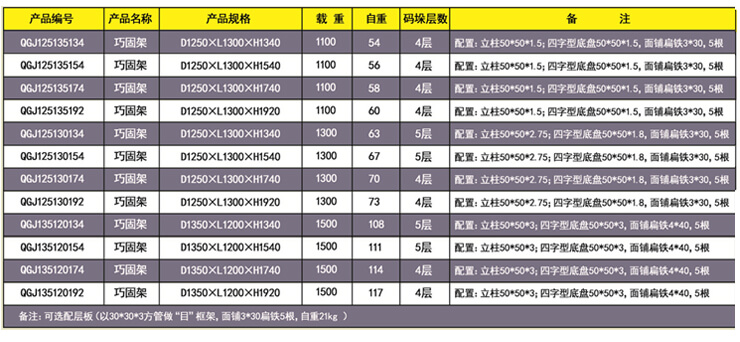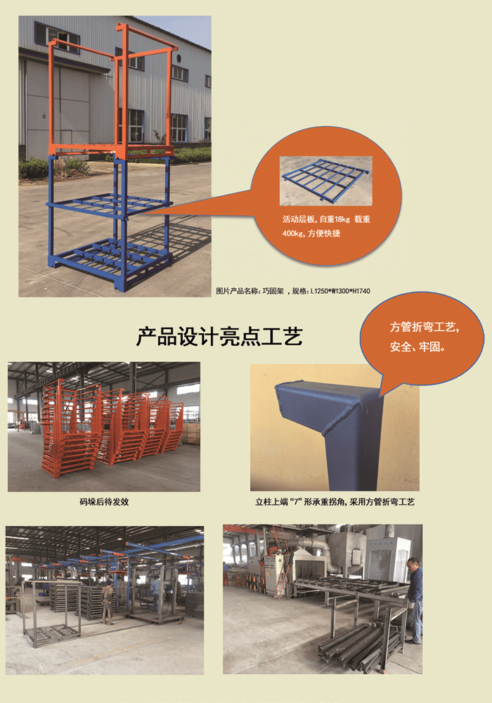巧固架 產(chǎn)品特點:底部碼垛角鐵成80°設(shè)計促使碼垛的巧固架越壓越緊。