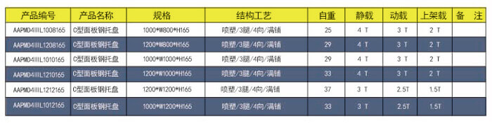 四向三腿——C型面板鋼托盤 技術參數(shù)說明: 產(chǎn)品編號: AAPMD4ⅢL1210165 產(chǎn)品規(guī)格: 1200*1000*165 產(chǎn)品自重: 33kg 防銹工藝: 靜電沙紋噴塑 產(chǎn)品靜載: 3000KG(均勻載重) 產(chǎn)品動載: 2500KG(均勻載重) 產(chǎn)品上架: 1500KG(均勻載重) 主要用途: 倉庫、車間周轉、物流倉儲